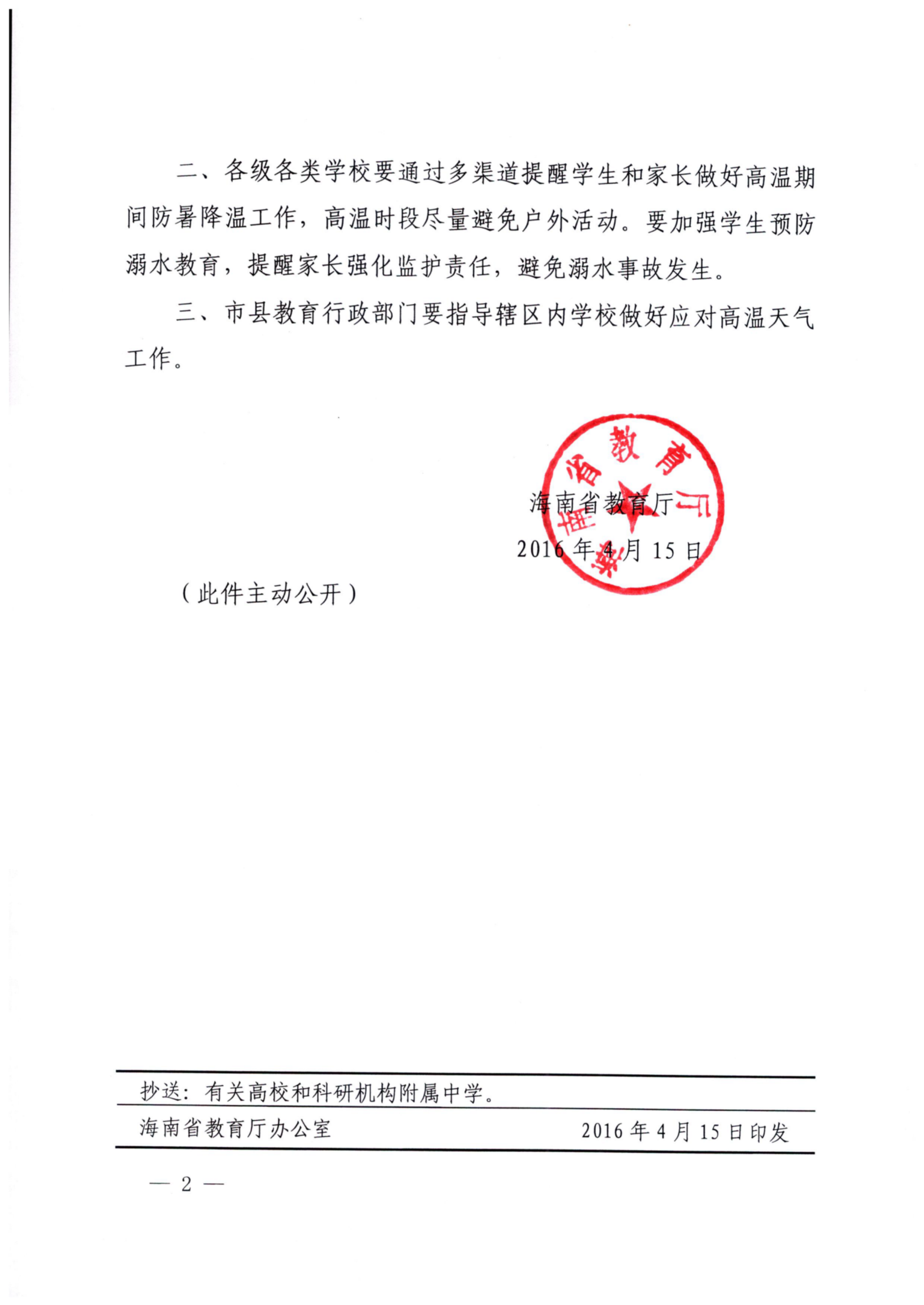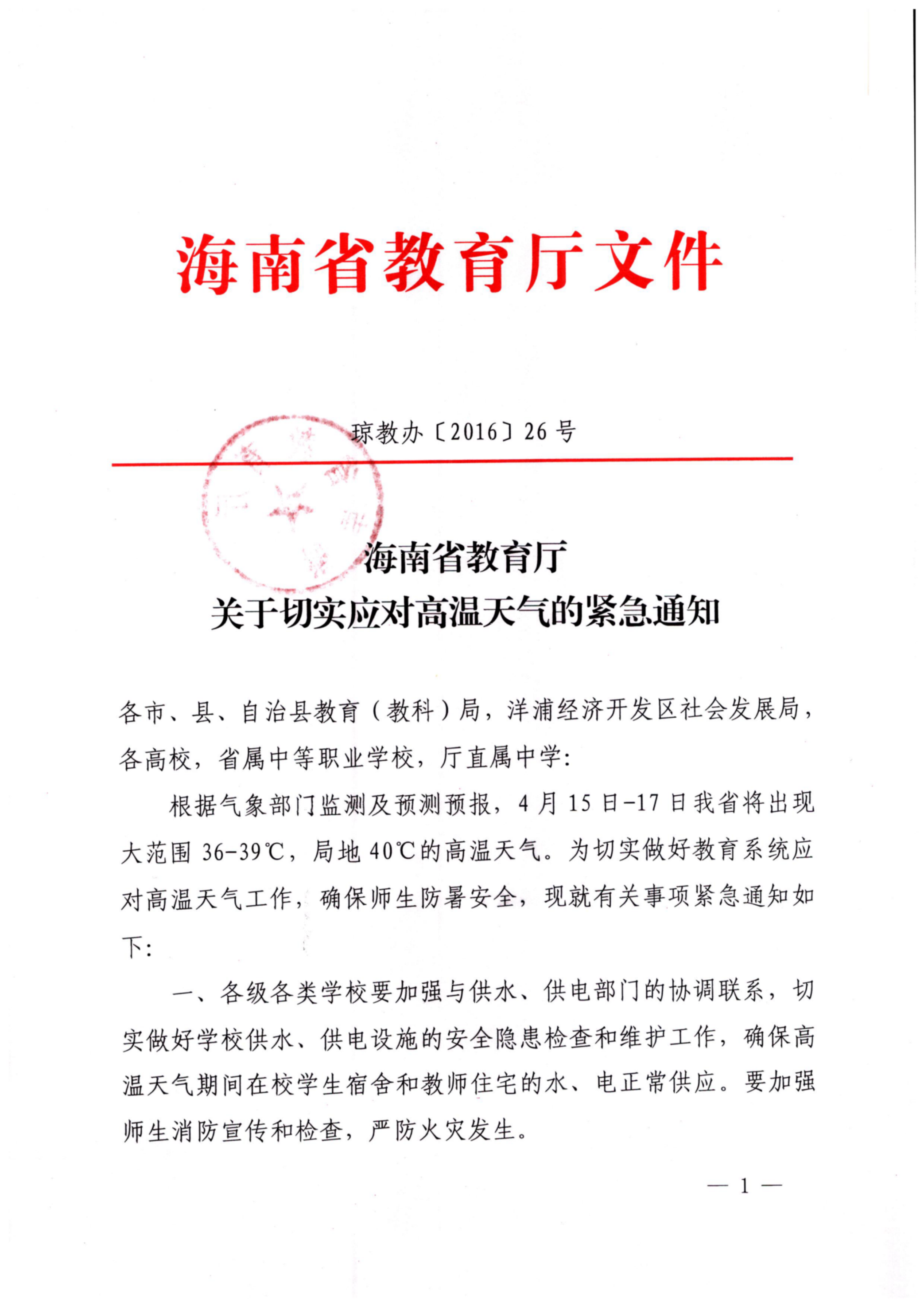 现将《海南省教育厅关于切实应对高温天气的紧急通知》转发给你们,请高度重视,切实做好应对高温天气工作,确保师生防暑安全。