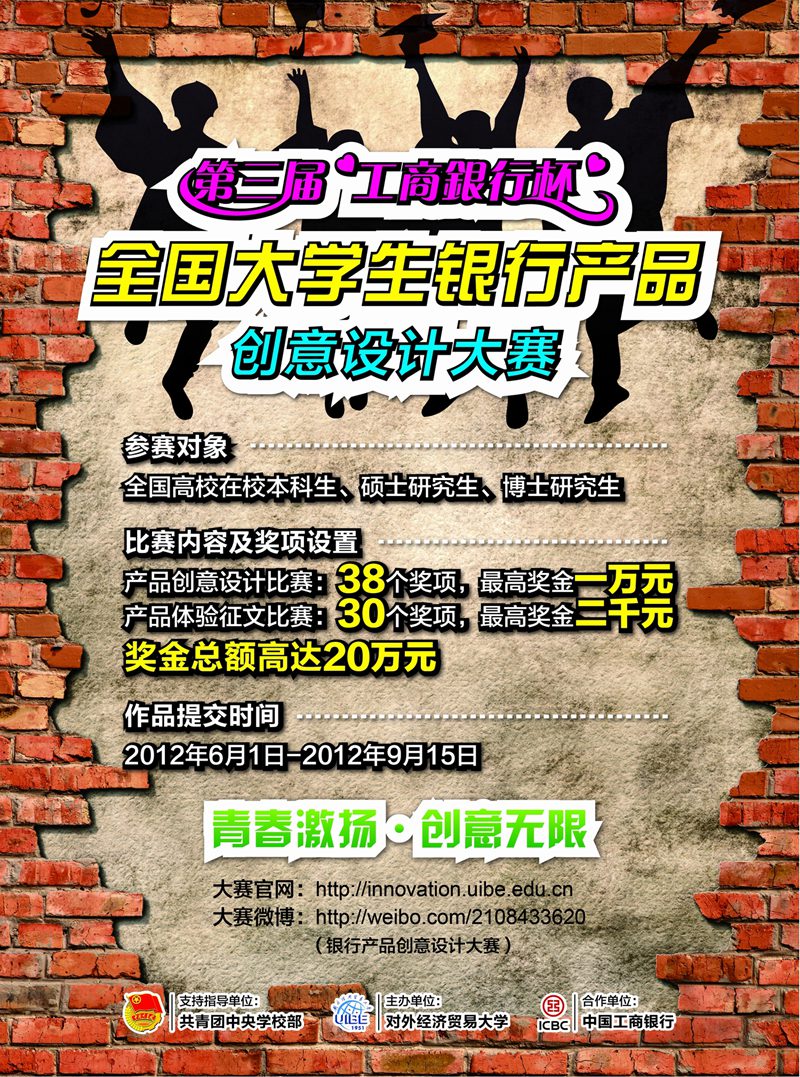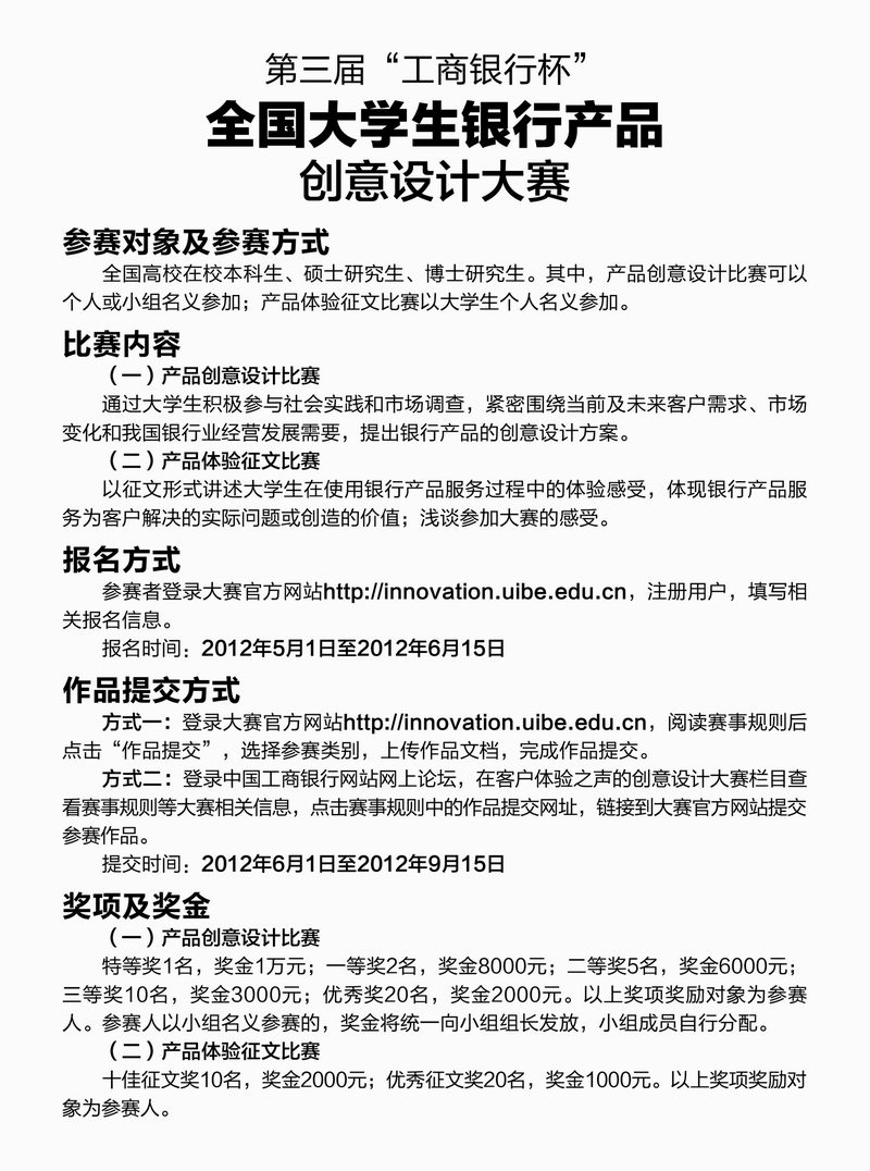 第三届全国大学生银行产品创意设计大赛正式启动 5月22日,由中国工商银行和对外经济贸易大学合作举办的第三届“工商银行杯”全国大学生银行产品创意设计大赛在北京正式启动。本届大赛特邀共青团中央作为支持指导单位,将指定参赛院校数量增加至56所,并在银行产品创意设计比赛的基础上增设了产品体验征文活动。同时,本届大赛还将与共青团中央倡导的提升青年社会实践能力、促进青年就业创业精神活动有机结合,更好地为大学生搭建展示自身才华、实现社会价值的广阔平台。 据了解,本届大赛现已开始接受报名,全国在校的大学生、研究生和博士生均可参与此次比赛,具体的报名方法和参赛要求可登录大赛官方网站(http://innovation.uibe.edu.cn)和官方微博(http://weibo.com/2108433620)查询。大赛组委会表示,将本着“公开、公平、公正”的原则从参赛作品中评选出优秀获奖作品,银行产品创意设计比赛和产品体验征文比赛的获奖选手可分别获得最高10000元和最高2000元的现金奖励,还有机会参加工商银行组织的实习活动。在活动期间,工商银行还将与各地区共青团组织和高等院校合作,广泛宣传普及金融知识,提供多样化的社会实践机会,并积极创造条件将大赛评选出的优秀创意转化为银行产品创新项目付诸实施。 据介绍,在前两届“工商银行杯”全国大学生银行产品创意设计大赛中,组委会共征集到来自海内外500多所高校、6000余名选手提交的近千件作品,许多创意紧扣生活细节,贴近实际需求,充满时代特色,为金融产品创新提供了有益参考和启发。经过专家评委会评议,共计76件创意作品获奖,另有20所高校获得优秀组织奖。经过两年积淀,大赛的社会覆盖面不断扩大,公众知名度持续提升,逐渐成为师生乐于参与、社会普遍认可、具有一定影响力的银校合作创新活动。实践证明,通过面向大学生征集银行产品创意设计方案的方式,不仅能为大学生提供理论联系实际的社会实践机会,提高创新意识和研究能力,培养适合社会需要的创新型人才,也有利于深化银校合作,汇集社会力量推进金融创新,提升金融服务水平。 活动组织单位相关负责人告诉记者,作为国内提供金融产品数量最多、创新能力最强的商业银行,工商银行牢固树立“服务客户、奉献社会”的企业使命,始终坚持“以客户为中心、服务创造价值”的经营宗旨,依托科技优势积极推进产品创新和服务提升,持续加强创新成果转化应用,围绕客户的金融服务需求研发和推广应用了一大批具有技术知识含量、高实用性、高易用性、高附加值的新产品和新服务。截至2011年末,工商银行已拥有各项产品3243种,比2005年增加了2.6倍,构建了跨资本市场、货币市场、保险市场的全领域产品体系。与此同时,工商银行的自主创新和可持续创新能力不断提升,目前拥有的国家专利数量累计已达178项,在我国银行业全部专利数量中的占比超过60%。对外经济贸易大学作为一所誉满全国、群英荟萃的财经类院校,秉承以人为本、开门办学的理念,长期以来在教学和科研方面取得了显著成就,为社会输送了大批青年创新型人才,本次在共青团中央的支持指导下,与中国工商银行合作办赛,必将进一步开辟社会各界携手培育创新型人才的崭新模式,营造鼓励创业、崇尚创新的良好社会氛围,推动金融创新成果向社会生产力的转化,有效促进创新型国家建设。各高校代表也表示将借助大赛提供的银校合作与大学生社会实践平台,丰富人才培养模式,鼓励大学生踊跃报名参赛,通过积极参与金融创新活动展示自身才华、提升实践能力、实现社会价值,促进金融创新与人才培养的良性互动。
