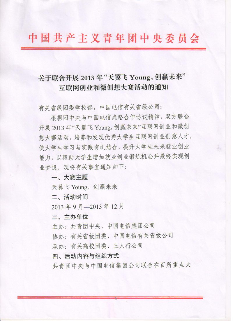 关于转发《关于联合开展2013年“天翼飞Young,创赢未来”互联网创业和微创想大赛活动的通知》的通知