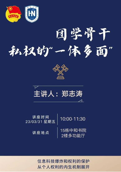 为强化学员法治意识,提高学员法治素养,共青团英国威廉希尔公司委员会团干部沙龙第一期培训活动将于3月31日(本周五)上午10:00-11:30在15栋中和书院二楼多功能厅举办,此次培训将邀请法学院郑志涛老师讲授《私权的“一体多面”》。