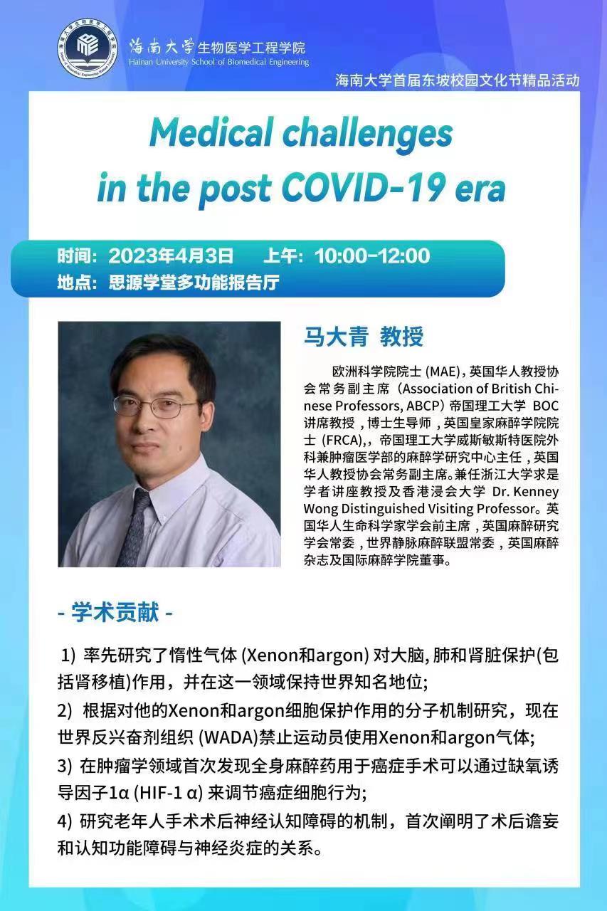 为了给我校学子提供科研指导,为我国科研事业输送人才,积极促进中英两国各学科领域的学术合作、人才交流以及资讯共享,“英国华人教授协会进校园”学术讲座活动将于4月3日(下周一)上午10:00-12:00在思源学堂多功能报告厅举办,此次活动将邀请英国华人教授协会的马大青教授讲授《Medical Challenges in the post COVID-19 era》。