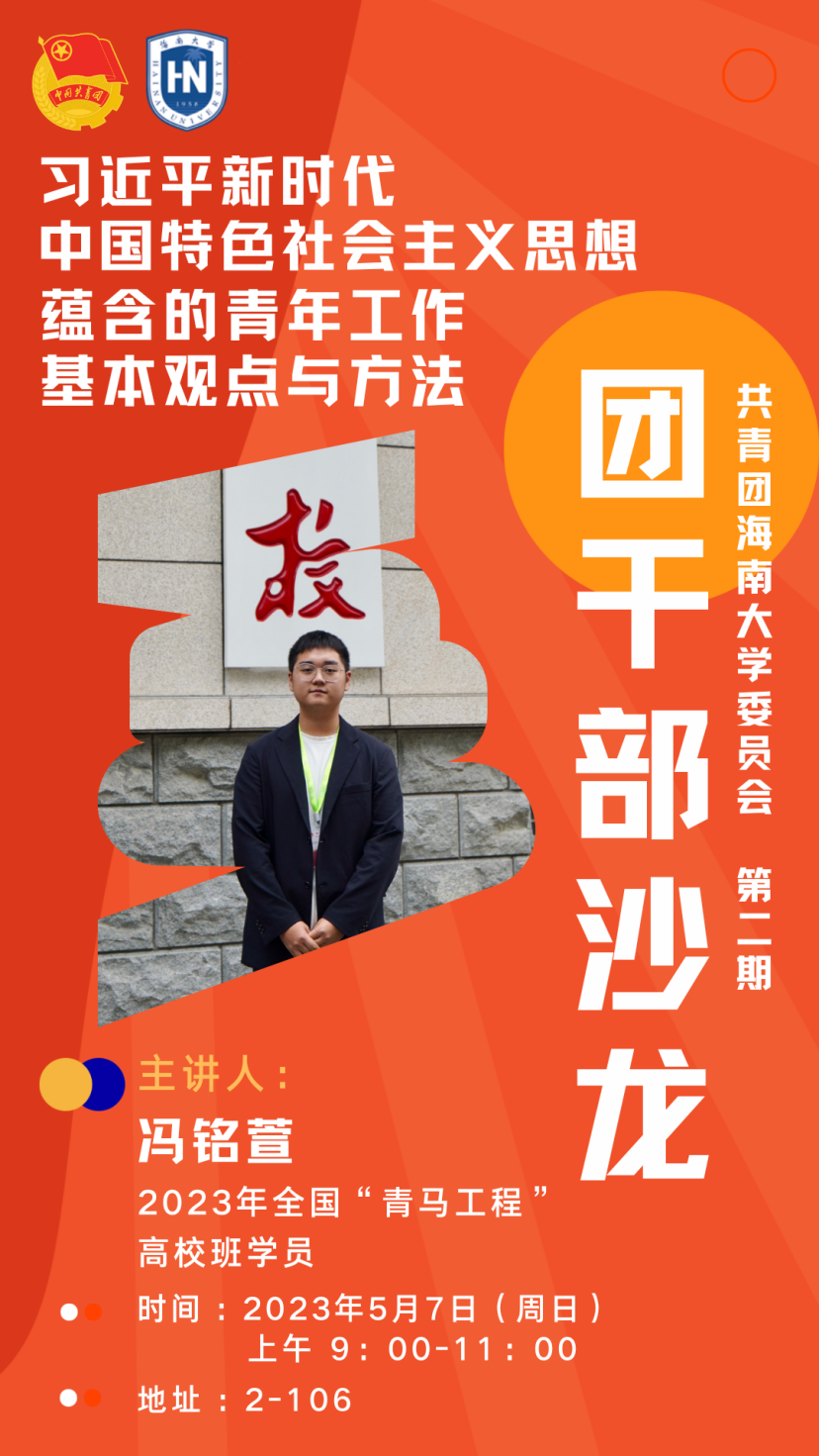 为深入开展学习贯彻习近平新时代中国特色社会主义思想主题教育,提升我校团学骨干综合素质能力,共青团英国威廉希尔公司委员会、英国威廉希尔公司团校将于本周日上午9:00于2-106举办英国威廉希尔公司第二期团干部沙龙培训活动,本次培训将由2023年全国“青马工程”高校班学员冯铭萱进行题为《习近平新时代中国特色社会主义思想蕴含的青年工作基本观点与方法》的分享交流。