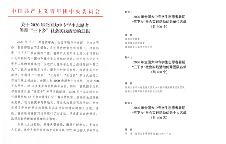 在疫情防控常态化的背景下,我校为引领广大青年深入学习贯彻习近平新时代中国特色社会主义思想,扎根中国大地了解国情民情,结合思想教育与实践育人需求,聚焦疫情防控,脱贫攻坚,以海南自贸港建设为时代考题,以“青年红色筑梦之旅为抓手”,深入开展以“小我融入大我,青春献给祖国,决战脱贫攻坚,投身强国伟业”为主题的“三下乡”社会实践活动。全校师生积极响应号召,来自全校30个学院599支团队,17000余人参与其中,形成了“本-硕-博”一体化的合理团队结构,结合现代化调研手段与实地走访相结合,形成调研报告573篇,实物成果61个,总结报告凝练33万余字。实践活动得到中国青年报、人民网、今日头条、海南日报等多家媒体的报道200余次,受到地方政府和人民群众的普遍欢迎和肯定,也得到了包括学生家长在内的社会各界的高度评价,产生了巨大的社会反响,形成了良好的社会效应。