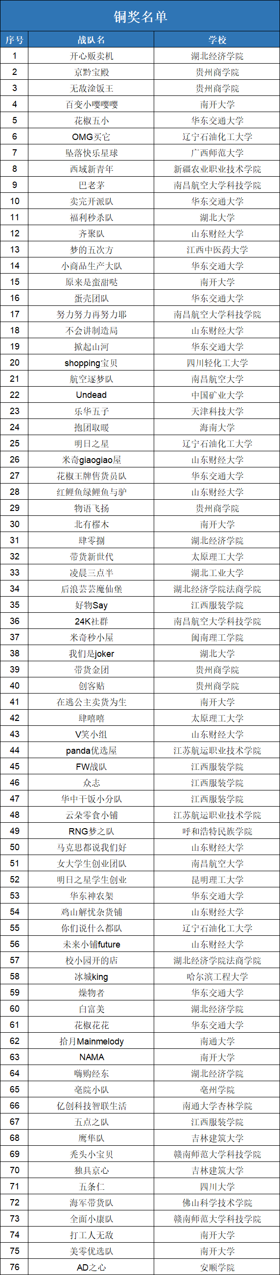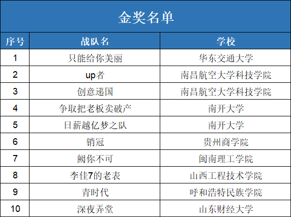 经过各高校参赛选手 3 个月的比拼,创青春互联网创意营销大赛共决出 10 个金奖、 34 个银奖、 76 个铜奖、 10 个优秀组织奖和 50 个杰出贡献奖,并评选出一批大赛优秀指导教师。