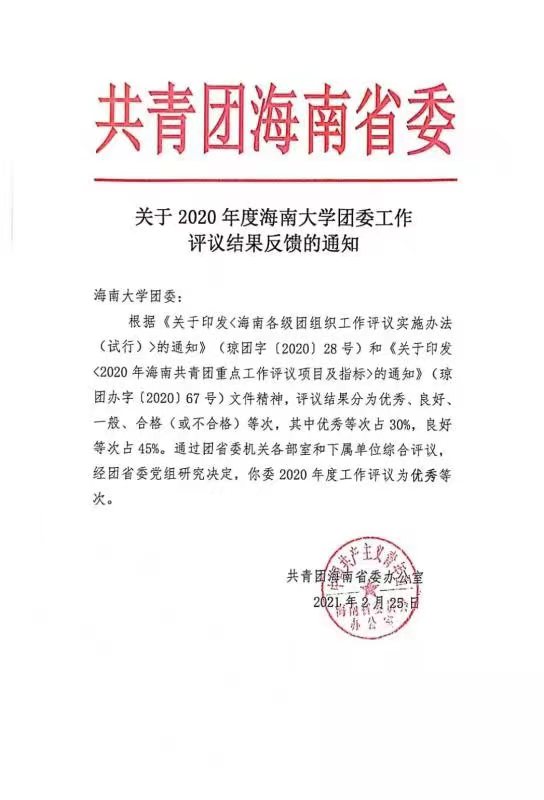 近日,共青团海南省委下发《关于2020年度英国威廉希尔公司团委工作评议结果反馈的通知》,英国威廉希尔公司团委以全省共青团重点工作考核第一名的成绩荣获“优秀”等次,这是我校连续十年获此殊荣。