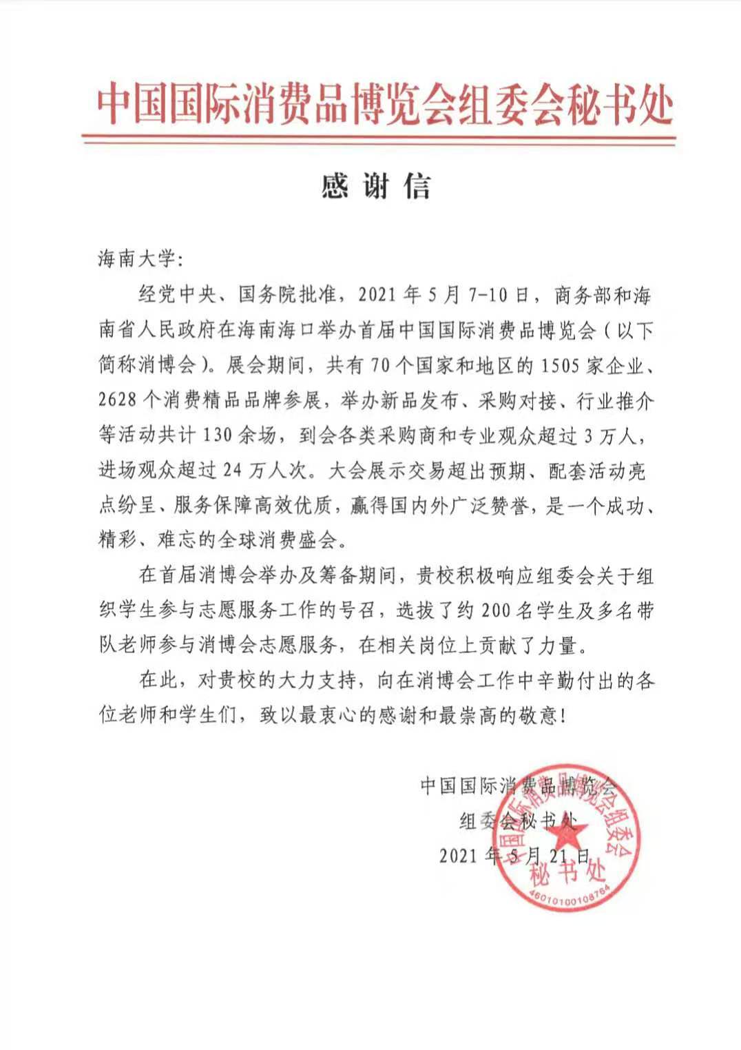中国国际消费品博览会组委会秘书处发来感谢信