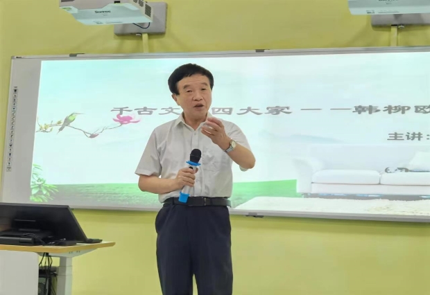 阮忠教授首先对“千古文章四大家”韩愈、柳宗元、欧阳修和苏轼的生平与关系进行了简要介绍,为大家详细阐述了“文章之道从读书始”,无望速成,无诱势利,分享了苏轼读书“每次作一意求之”的方法,这样书中的内容才能精通,应对起来,方能得心应手;提出“读书之道也是做人之道”,以欧阳修、苏轼的家庭教育为例,向同学们阐述了做正直的人对文章写作的重要性;总结了文章四大要法“务去陈言”“气盛言宜”“得意明事”“行云流水”,让大家了解到韩柳欧苏一生都在坚持写作,写作伴随着阅读,阅读强化了写作,贫贱不畏饥寒,富贵不贪逸乐,终生践行,文章构成了他们生活的另一个世界。