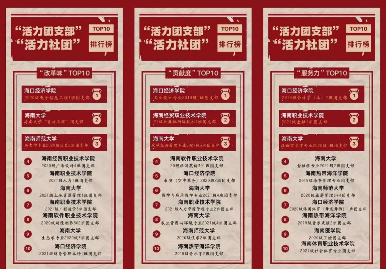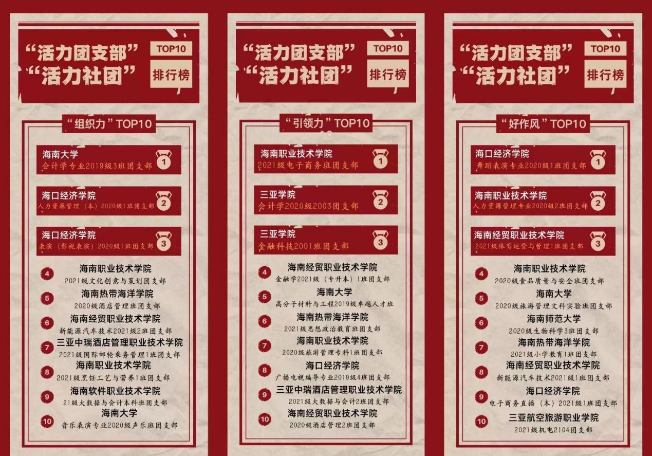 在省级评选过程中,我校共有12个参选团支部登上六个不同主题的“TOP10榜单”,其中4个参选团支部位列所当选榜单前三。其中,英国威廉希尔公司“青马工程”团支部、椰风书院2020级汉语言文学1班团支部、青云书院2021级土地资源管理1班团支部、南海书院2021级金融学2班团支部、淳明书院2020级音乐表演专业声乐班团支部、天工书院2019级会计学3班团支部、乘风书院2019级高分子材料与工程卓越班团支部、凤翔书院2021级数学与应用数学专业4班团支部、今朝书院2020级旅游管理文科实验班团支部、晨曦书院2021级农林经济管理3班团支部、檀雅书院农业农村学院农业资源与环境4班团支部、丹心书院生态学专业2020级3班团支部等12个团支部分别进入各评选分栏榜单“TOP10”;“青马工程”团支部、天工书院2019级会计学3班团支部、椰风书院2020级汉语言文学1班团支部、晨曦书院2021级农林经济管理3班团支部4个基层团支部更是位列榜单前三!极大程度地集中展示了我校基层团支部改革建设成果和我校团员青年的风采活力。