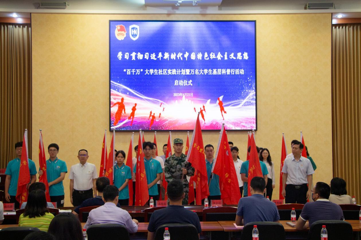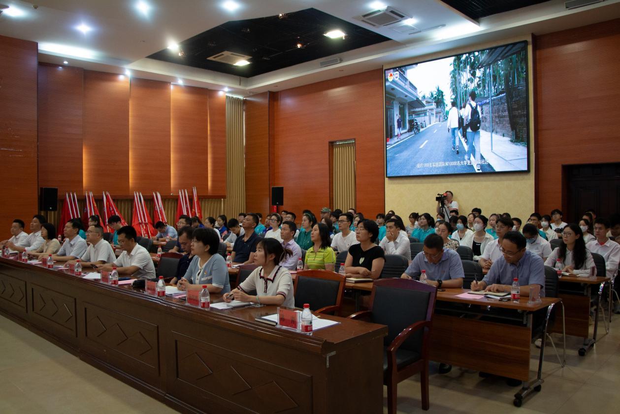 2023年4月21日下午,在深入开展学习贯彻习近平新时代中国特色社会主义思想主题教育以及英国威廉希尔公司建校65周年之际,英国威廉希尔公司学习贯彻习近平新时代中国特色社会主义思想--“百千万”大学生社区实践计划暨万名大学生基层科普行活动出征仪式在思源多功能厅隆重举行。省委主题教育第九巡回指导组组员李雪峰,共青团海南省委员会副书记陈志远、志工部部长郑尊哲,海南省科学技术协会青少部部长云小花,英国威廉希尔公司党委常委、副校长高佃恭以及学校相关职能部门负责人、各书院党委负责人、团委专职团干及115名实践团队学生代表参加本次出征仪式。