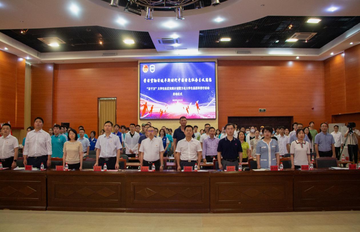 启动仪式在雄壮的中华人民共和国国歌声中正式开始。仪式首先播放了“‘百千万’大学生社区实践计划暨万名大学生基层科普行活动出征”宣传片,向参会人员介绍社区实践计划和万名大学生基层科普行活动的意义和主要计划,展示了青年大学生生动实践风采。
