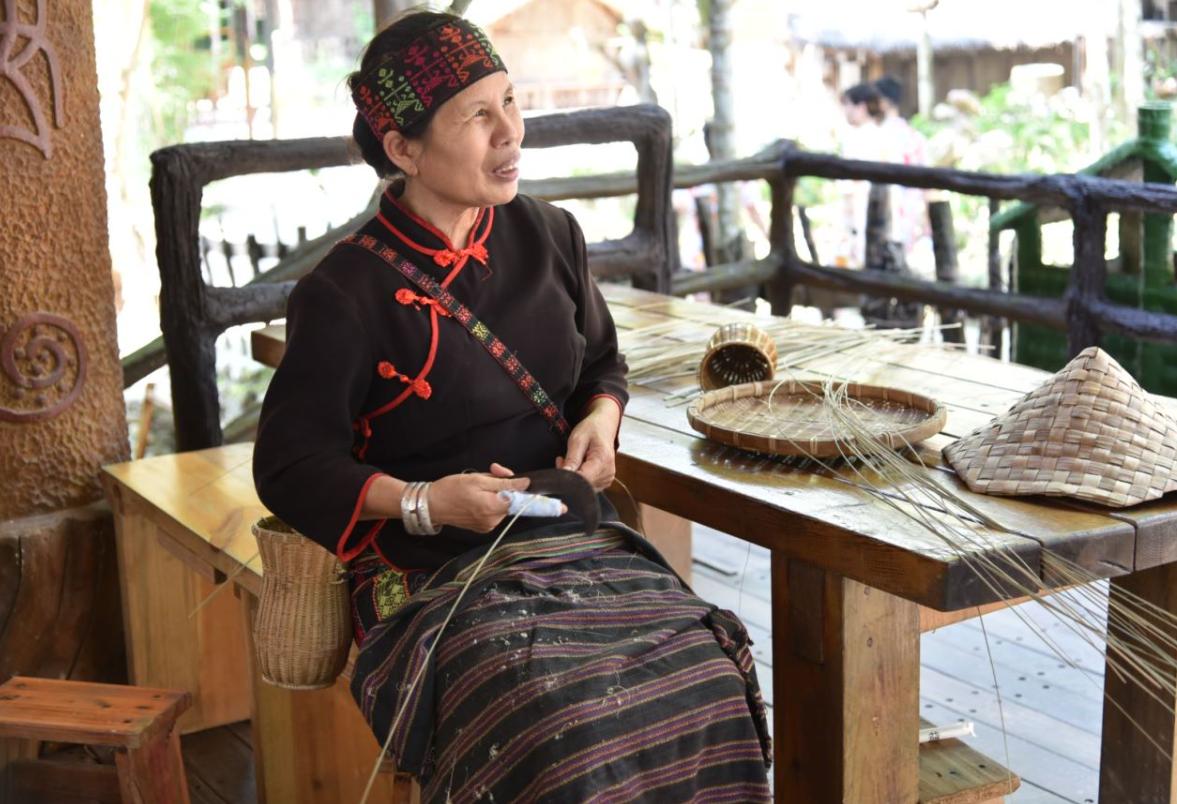 非遗传承人在编织藤条手工艺品