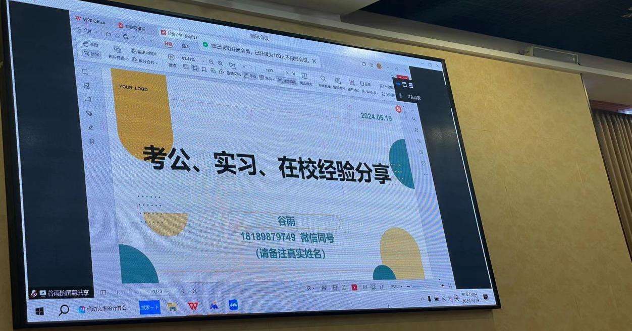 王鑫洋、马浚程、谷雨三位分享人分别从公务员考试备考方法及感悟,“在实践中感悟理论,到一线去收获成长”的支教志愿服务经历,考公、实习和在校经验分享等不同主题与在场同学分享了自身择业、就业和职业发展路径,鼓励同学们多学习、多尝试,保持积极乐观的心态,为强国建设、民族复兴伟业添砖加瓦、增光添彩。
