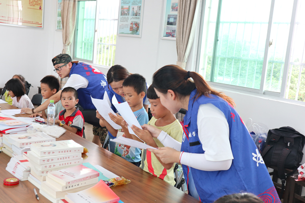 活动当天,志愿者们早早就来到乐妹村,与当地30多户结对帮扶的孩子们会面,深入了解孩子们的学习、生活情况。记者了解到,为了给孩子们带来别样的学习活动内容,志愿者们提前精心策划,将推广普通话教育与本次主题活动相结合,设计了诵读诗歌、学唱歌曲、知识宣讲、课外游戏等活动内容。活动中,志愿者们带着孩子们诵读《天上的街市》,学唱歌曲《外婆的澎湖湾》,在学习诗歌、歌曲的过程中还不忘给孩子们纠正普通话发音,鼓励孩子们要学习讲好普通话。此外,志愿者们还对孩子们进行了安全知识宣讲,防蚊虫叮咬、食物禁忌、化解秋乏……无一不是实用的生活技能。