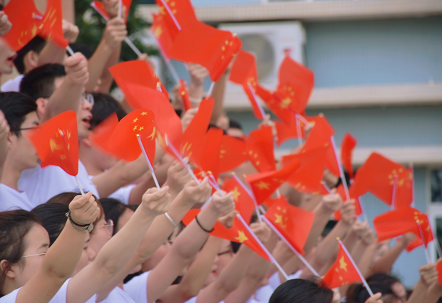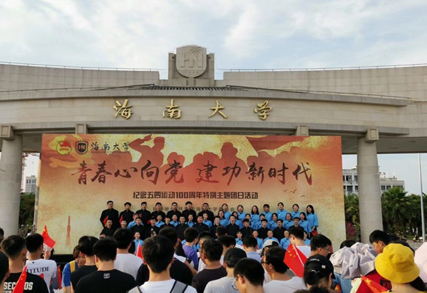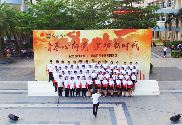 参加活动的范若晖同学说:“作为现场活动的工作人员,当《我和我的祖国》的旋律在三个合唱点同时响起,嘹亮的歌声瞬间响彻海大的每个角落,大家都沸腾了,数千支国旗在大家的手中飘扬,形成一片片红色的海浪。海大青年用自己的方式纪念五四运动100周年,用歌声祝福我们的祖国。”