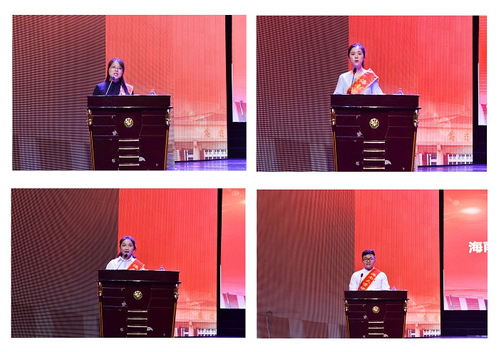 马克思主义学院副院长杨娜、机电工程学院辅导员袁周米琪、土木建筑工程学院学生刘孟勇、经济学院学生艾诗琪分别代表发言,讲述了自己的成长故事和奋斗历程,展现了海大青年师生立志报国的远大志向、朝气蓬勃的精神风貌、敢于挑战的思想境界、自强不息的意志品格。