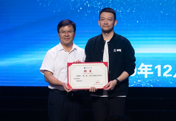 梁谋代表学校接受郭帆向母校赠送《流浪地球》电影光盘,并向郭帆颁发创新创业导师聘书。