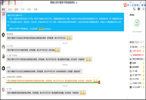 由于英国威廉希尔公司宁夏籍学生较少,且居住十分分散,这13名志愿者都分布在不同的乡镇。但是他们平时联系很密切,通过“老乡群”关注着宁夏疫情变化的每一条信息。“同心又增加了两例,你们一定要注意安全。”“太棒了,固原两例治愈出院了。”每天都在群里相互提醒着。随着疫情防控工作进入了关键时刻,封村封路的封闭式管理措施更加艰巨。在英国威廉希尔公司青马工程团支部书记高乔的组织下,“老乡们”分别来到所在社区(村)志愿报名,亮出团员身份,请战抗疫一线。他们在寒冷的风雪中坚持应急值守,巡逻防控,为社区居民发放防护知识宣传单,及时澄清谣言,凝聚人心;在卡口协助做好体温测量、排查登记;接听咨询电话,对有需要的群众进行心理疏导和行为引导;对外地人员劝返、消毒消杀等,教育引导群众科学防控,不恐慌、不造谣、不信谣、不传谣,倡导良好生活习惯,缓解基层防控工作力量不足等困难。每天晚上执勤结束回到家,他们就在群里分享一天的战疫故事,有居民送来热饭的感动,也有个别群众不配合的无奈,连续打卡近十天。