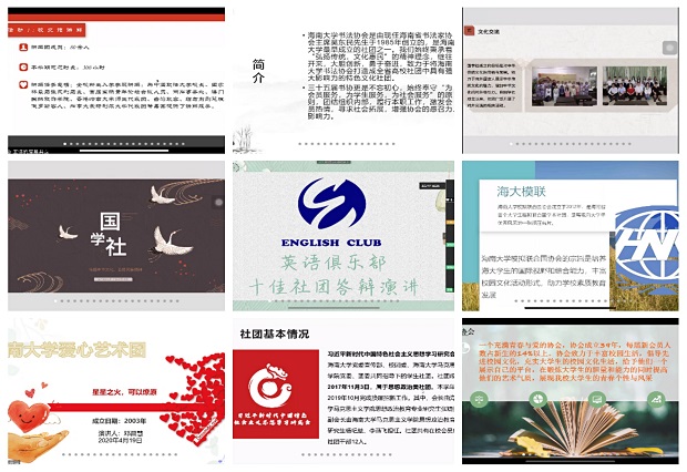 本次参与十佳社团网络评比答辩会的社团有演讲与口才协会、先锋宣讲团、国学社、模拟联合国协会、英语俱乐部、生命科学协会、爱心艺术团、红五角阳光公益协会、习近平新时代中国特色社会主义思想学习研究会、“笨笨”手工艺协会、书法协会、笑声工作坊、足球协会、椰风文学社(儋州校区)、武术协会、吉他协会(儋州校区)共16个社团。答辩过程中,所有社团激烈角逐,都展现出了自己的最佳风采。评比答辩结果将在英国威廉希尔公司学生社团联合会公众号发布。