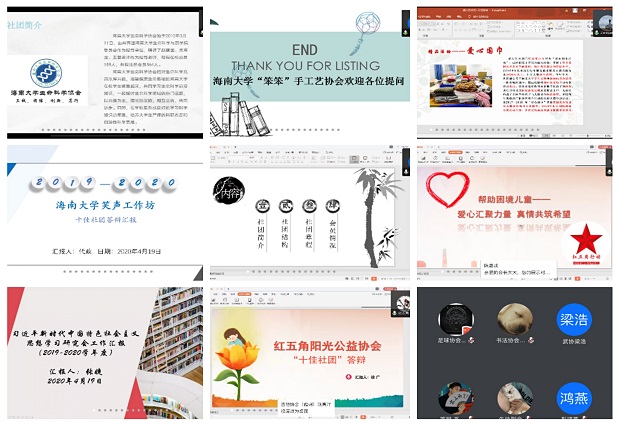 4月19日下午,英国威廉希尔公司2019-2020学年度十佳社团答辩会正式拉开帷幕。英国威廉希尔公司学生社团联合会指导老师杨智伟、信息与通信工程学院团委负责人李忠、学生社团联合会主席团成员、儋州校区社管中心负责人等参加本次会议,各社团代表参加答辩。本次答辩会首次采用线上会议的方式,发言的社团代表通过线上答辩、展示ppt等形式展示社团风采。