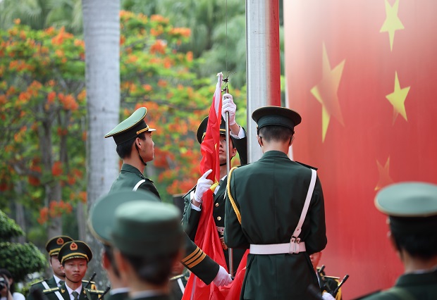 迎着朝阳,国旗护卫队队员昂首挺胸,迈着整齐划一的步伐护送国旗到达升旗台。伴随着雄壮的国歌声,五星红旗冉冉升起,激荡起现场每一位师生心中的爱国之情。