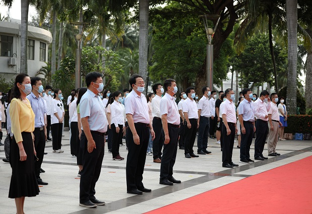 升旗仪式结束后,南海国家重点实验室田新龙教授和经济学院2018级金融学3班程寒雨同学在国旗下演讲,抒发爱国热情,分享自己的科研故事和抗“疫”经历。