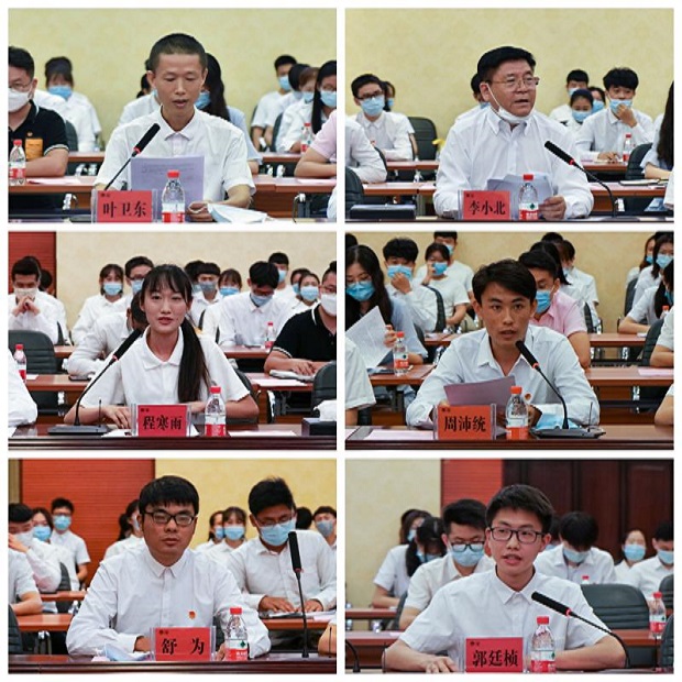 植物保护学院叶卫东、国际教育学院李小北作为先进典型教师代表先后发言,讲述了帮助学生返校复学的工作感悟。经济学院程寒雨、旅游学院周沛统、生态与环境学院舒为、土木建筑工程学院郭廷桢作为先进典型学生代表发言,分享了疫情防控期间参加当地志愿服务工作的经历和感受。