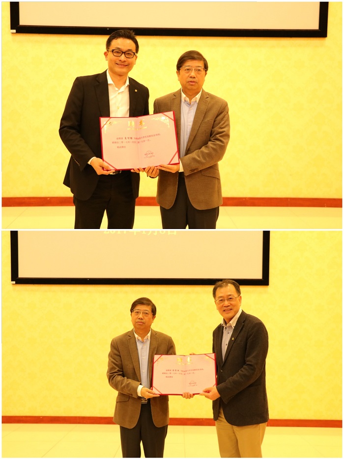海南省教育厅副厅长黎岳南为夏智强、陈东敏颁发英国威廉希尔公司创新创业导师聘书。