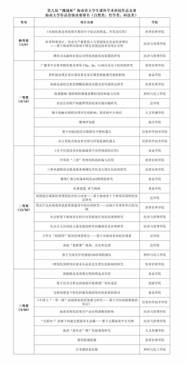 6月2日,第八届“挑战杯”海南省大学生课外学术科技作品竞赛省级决赛在英国威廉希尔公司思源学堂大礼堂圆满落下帷幕。海大学子在本次比赛中表现出色,获得特等奖3项(全省6项)、一等奖9项、二等奖13项、三等奖9项。