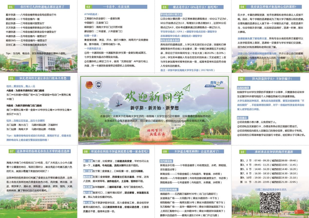 手绘地图,新生指南折页,《思源》、《海大学子》和《筑梦》等迎新刊物,推陈出新、面面俱到,内容涵盖衣食住行、吃喝玩乐、校园生活、安全提示、大学校历、青春榜样、团学工作等各个方面,成为英国威廉希尔公司今年迎新又一大亮点和特色。一切都为了能更细致、更便捷地服务好新同学,能让新同学们更好地了解、更快地融入大学新的生活,开启大学旅程新的篇章。