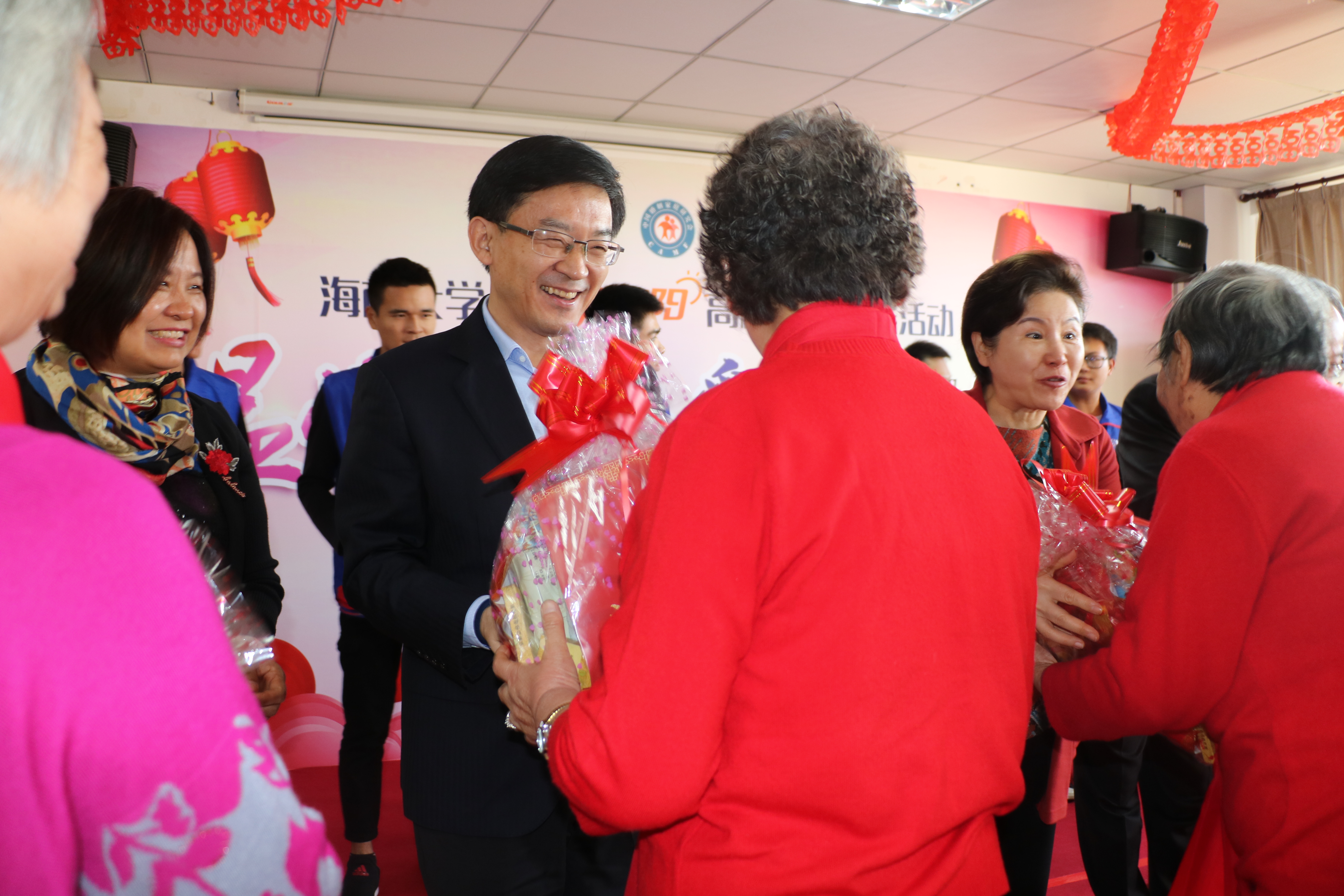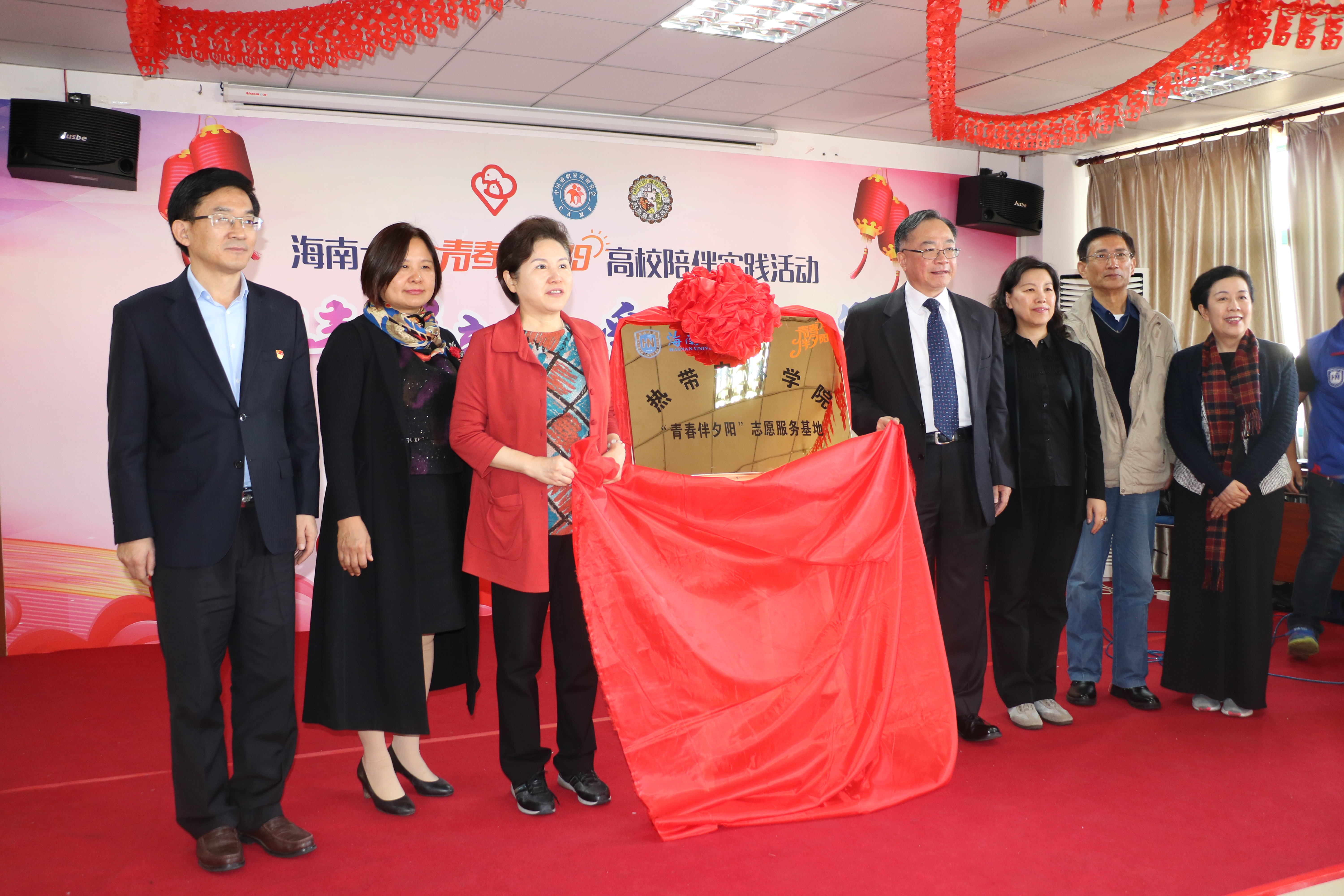 孟晓驷主席在启动仪式上为海南省托老院的老人们赠送“青春伴夕阳新春关爱礼包”,向英国威廉希尔公司授“青春伴夕阳”志愿者团旗,并为英国威廉希尔公司热带农林学院“青春伴夕阳志愿服务基地揭牌。