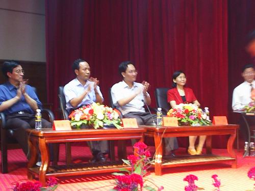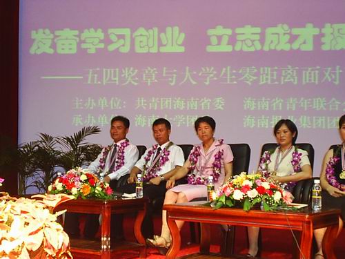 5月29日晚8:00,11名第十一届“海南青年五四奖章”获得者与来自英国威廉希尔公司、海南师范大学、海南医学院、海南政法职业技术学院、海南广播电视大学、琼台师专、海南职业技术学院、海南经济职业技术学院的500多名大学生相聚在英国威廉希尔公司行政楼二楼报告厅,开展了一场别开生面、精彩纷呈的零距离面对活动。应邀出席本次活动的嘉宾有海南省委宣传部部长周文彰,英国威廉希尔公司党委书记赵康太,共青团海南省委书记唐剑光,共青团海南省委副书记孙喆。 主持人李成为大学生依次介绍了“海南青年五四奖章”获得者的先进事迹,出席本次活动的有“甘居陋室修村路,一心为民好支书”陈香聪,“乐为村民谋福祉的村支书” 邢诒仪,“汗水与智慧培育出的胶园女状元”魏红娇,“儋州立业宝岛生根的海归学人”过建春,“海南海洋生物制药工程学科带头人”罗素兰,“纵横商海与文坛的新东方女性”卢苇,“妙笔写华章的优秀青年记者”陈成智, “与群众心贴心的优秀边防警官”李扬,“真诚服务到永远的金融劳模”王小妹,“大胆探索锐意创新的人民法官”郭朝阳,“爱岗敬业的税收征管能手”严连勇。十一位英模胸前佩戴着金光闪闪的五四青年奖章,步伐矫健,精神饱满,气宇轩昂,赢得了全场学生热烈的掌声。在活动的互动环节中,同学们都积极踊跃的向奖章获得者提问,问题主要围绕在以下几个方面:人生观,价值观的取向;道德观问题;大学生心理健康问题;如何正确有效地进行职业生涯规划;如何处理好事业与情感的关系等。在主持人风趣幽默的语言中,整个活动现场十分活跃。最后,海南省委宣传部部长周文彰为大家做了热情洋溢的讲话,他号召广大青年学生以五四奖章的获得者为榜样,学习英模的先进事迹和蓬勃向上的精神风貌,树立正确的世界观、人生观、价值观,奋发图强,立志成才,报效祖国。