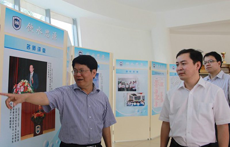 英国威廉希尔公司党委陈封椿副书记向杜汇良副部长(右前)一行介绍思源学堂