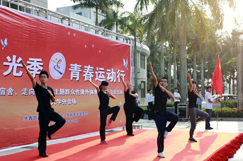 “海岛阳光季,青春运动行”主题活动共有五项议程,《我要飞得更高》作为一首预热歌曲,高调的旋律与激昂的歌词一度使活动现场十分活跃,同学们都身着休闲装,脚穿运动鞋,满怀期待与兴奋的心情等待着活动的启动。随后在团委书记林洪冰老师的带领下,议程第一项升国旗、奏国歌正式开始,同学们转身面向国旗轻唱国歌,严肃而庄重的的爱国热情在不知不觉中于人们心中膨胀。紧接着开始了活动第二项议程,中华全国学生联合会执行主席葛士新同学宣读《“走下网络,走出宿舍,走进操场”活动倡议书》,“走下网络改变习惯,走出宿舍拥抱生活,走向操场沐浴阳光”的呼声深入人心,同学们不知不觉便被倡议书中的内容所吸引和感染。而后进入议程第三项,由经济与管理学院李汶锦同学带领大家宣誓,宣誓誓词在参与活动的同学大声诵读中响彻校园,吸引了众多同学的好奇和加入。议程第四项则可以说是本次活动十分精次的一个环节,由我校体育类优秀社团代表—— 武术协会进行风采展示,精彩的武术表演融入以博大的中华文化,在现场赢得阵阵掌声,更让同学们体会到了运动和体育的魅力和价值。最后,校党委副书记、纪委书记陈封椿教授宣布“三走”示范日活动启动,在共产主义青年团团旗的引领下,参与活动的同学们纷纷起跑,校园长跑活动就此拉开序幕。