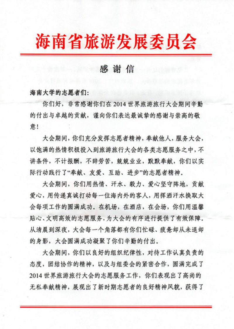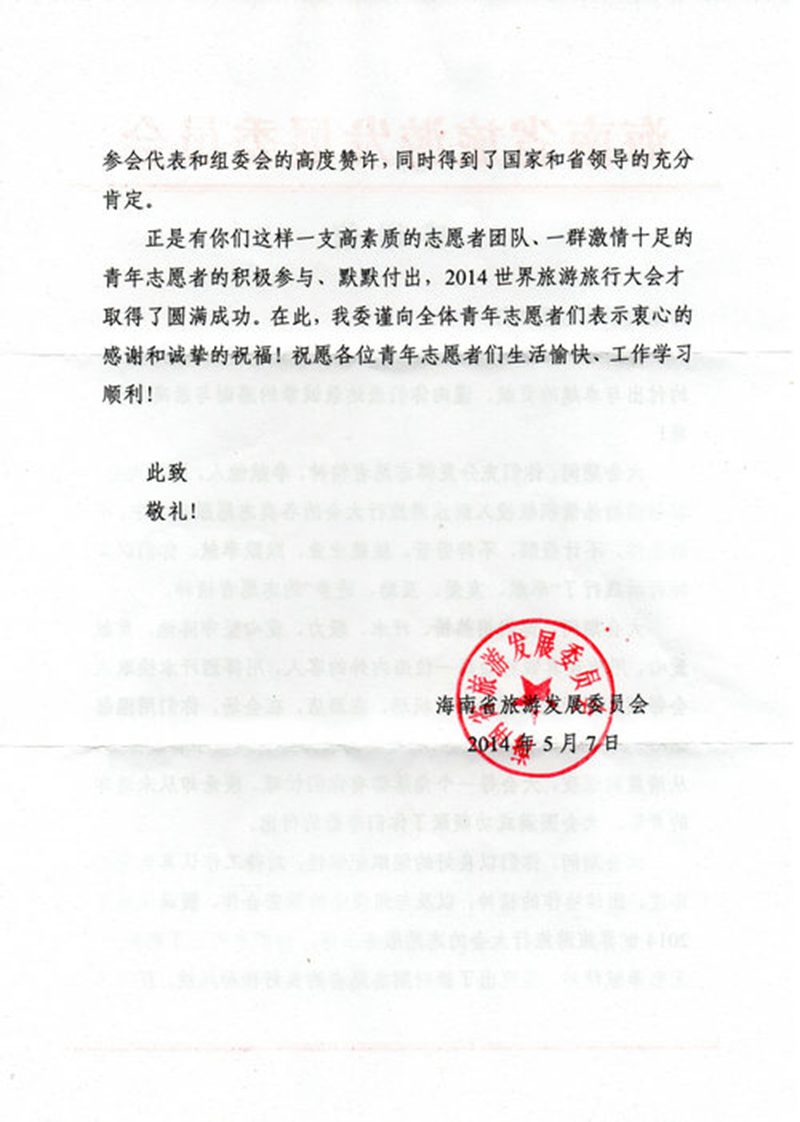 致英国威廉希尔公司2014世界旅游旅行大会志愿者——一封来自海南省旅游发展委员会的感谢信
