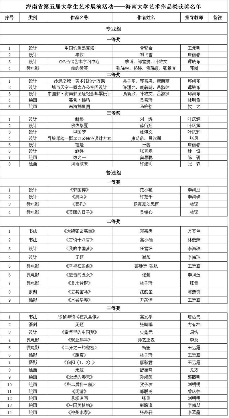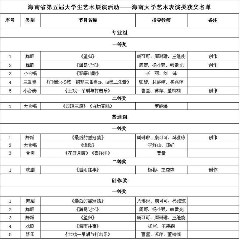 在艺术表演类中,我校报送的10个节目(专业组6个,普通组4个)共斩获一等奖8项,二等奖2项;其中,专业组一等奖5项,二等奖1项;普通组一等奖3项,二等奖1项。另外,我校报送的10个节目中,5个节目为创作节目,均获得创作一等奖(全省共9项创作一等奖,我校荣获5项)。在艺术作品类中,我校共报送50件作品(专业组20件,普通组30件),共斩获一等奖8项,二等奖14项,三等奖22项;其中,专业组一等奖4项,二等奖5项,三等奖8项;普通组一等奖4项,二等奖9项,三等奖14项。我校也因出色的组织工作荣获“海南省第五届大学生艺术展演优秀组织奖”。