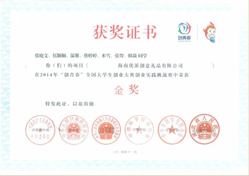 经过激烈角逐,我校《海南优派创意礼品有限公司》以优异的成绩荣获创业实践挑战赛金奖,这是海南省高校获得的第一个金奖。此外,《海口三容教育信息咨询有限公司》获得创业实践挑战赛铜奖;《海南09水产科技有限公司》、《兜圈r海岛旅游定制》、《南香生物科技有限责任公司》获创业计划竞赛铜奖;《BB公益计划》获得公益创业赛铜奖。在MBA专项赛中,《Green果茶饮品有限责任公司》荣获铜奖;移动互联网专项赛中,《掌上校园APP》和《李想益购有限责任公司》荣获铜奖。