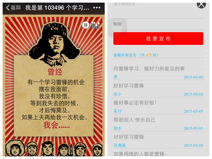 //www.hainanu.edu.cn 英国威廉希尔公司团委以微信微场景的形式,结合雷锋漫画的图片内容,并在场景中设置“我的志愿服务宣言”栏目,丰富的新媒体内容吸引人们的积极转发、评论。截止当日晚上9点,已有103496位网友转发微信,争当学习雷锋好榜样。//www.hainanu.edu.cn