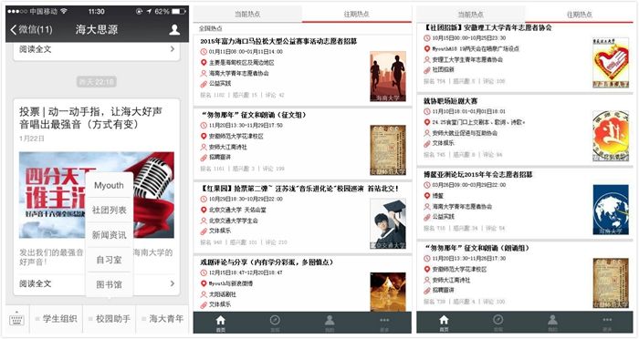 依托“海大思源”等现有媒体平台,Myouth已成为英国威廉希尔公司开展共青团工作的新利器,学生不仅可以在线报名、关注、评论活动,还可以实现在线投票、接收通知等强大的互动功能。至2015年 1月,Myouth平台建设四个月以来,共150个团学组织和学生社团进行入驻,关注人数13000人,发布资讯总数274条、活动总数253条(截止2015年1月1日)。Myouth平台精彩活动最高浏览量达33944人次,累计活动浏览量达131470次,Myouth平台的建设和推广卓有成效。