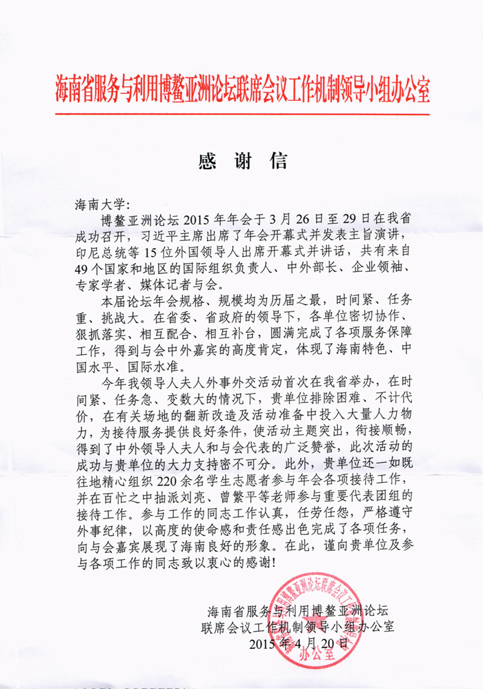致英国威廉希尔公司——一封来自海南省服务与利用博鳌亚洲论坛联席会议工作机制领导小组办公室的感谢信
