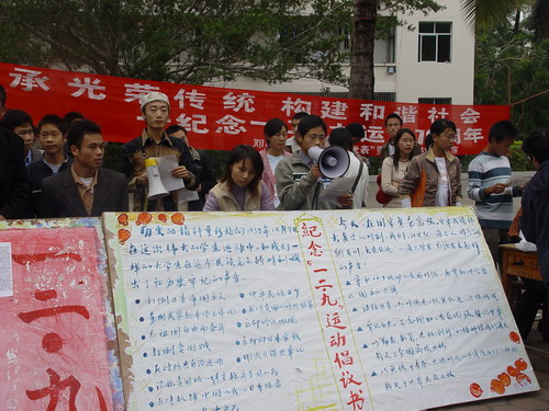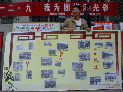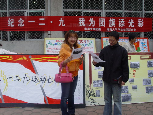 值“一二•九”运动七十周年之际,为弘扬爱国主义精神和民族精神,引导全校团员青年践行“三个代表”重要思想,用实际行动落实科学发展观,服务大局,奉献社会,我校团委、学生社团联合会、邓小平理论与“三个代表”重要思想研究协会在学生区第二食堂联合举办了以“纪念一二•九,我为团旗添光彩”为主题的大型宣传活动。 学生社团联合会干部以板块和宣传单的形式向同学介绍了1935年12月9日在中国共产党领导下的这场大规模学生爱国运动的背景和历史意义。邓小平理论与“三个代表”重要思想研究协会会员向全体海大青年发出《纪念“一二•九”运动倡议书》,号召全体21世纪的“海纳百川 大道志远”的海大学子“秉承一二•九运动爱国传统,高擎新时代爱国主义大旗!继往开来,与时俱进,抓住机遇,迎接挑战!牢记历史,不忘国耻,发奋图强,振兴中华!以‘勤奋、求实、进取、创新’的精神使我们海大鼎足于全国高校之林!以无愧于青春,无愧于时代的业绩,使我们的祖国鼎足于世界民族之林!”邓小平理论与“三个代表”重要思想研究协会会员还举办了 “一二•九”运动知识现场有奖问答,将本次活动推向高潮。 今年是纪念“一二•九”运动七十周年。海大学生将继承和发扬“一二•九”精神,弘扬爱国主义精神,修身立志,奉献社会。