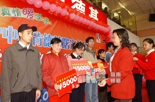 以“曙光耀新年、真情暖学子”为主题的英国威廉希尔公司2005-2006学年“中国肯德基曙光基金”捐助仪式29日下午在明珠广场举行。英国威廉希尔公司的30名家境贫寒、品学兼优的曙光基金受助大学生现场接受了捐助。出席了捐赠仪式有共青团海南省委副书记孙喆、省青基会秘书长羊光然、英国威廉希尔公司团委书记符成彦、百胜餐饮(深圳)有限公司区经理雷晶以及英国威廉希尔公司团委的老师。 自2003年“中国肯德基曙光基金”在英国威廉希尔公司启动以来,已累计捐款30万元,资助我校贫困生30人次。这批受助大学生每年可得到该基金提供的5000元经济资助,并且可以连续受助四年,除资金捐助以外,曙光基金还提供受助大学生在当地肯德基餐厅勤工助学的机会, 帮助他们认识社会,提高能力。目前我校已有20名受助生参加了肯德基餐厅勤工俭学活动。 “中国肯德基曙光基金”由中国百胜餐饮集团所属肯德基公司捐资3800万元设立,中国百胜餐饮集团与中国青少年发展基金会合作,连续10年资助贫困大学生,每名受助大学生每年将得到该基金提供的5000元经济资助,并且可以连续受助四年。目前已经在北京、上海、福州、海口等城市的42所大学实施,一共有860多名贫困大学生受到该基金的资助。这是目前跨国公司与中国青少年发展基金会合作资助贫困大学生基金项目中规模最大、战线最长、资助额最高的一项助学基金,也是所有项目中具备网络化管理,并且突出受助生社会实践的最有特点的公益项目。