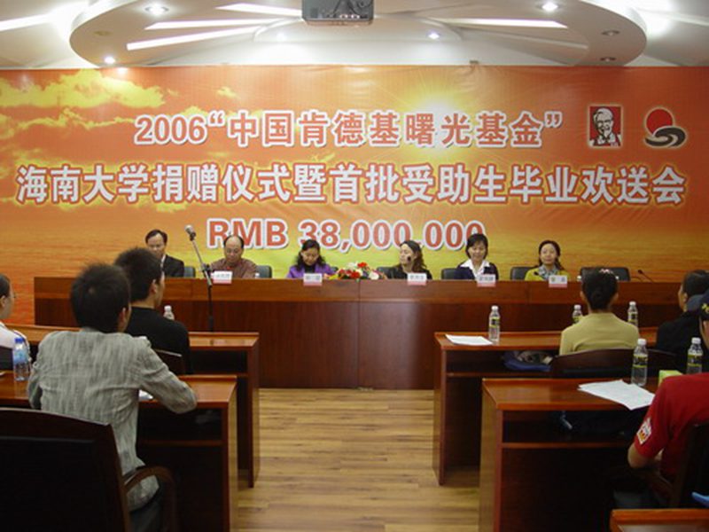 2006年12月27日下午,2006年度“中国肯德基曙光基金”捐赠仪式在我校行政楼一楼报告厅隆重举行。 出席本次捐赠仪式的领导和嘉宾有共青团海南省委副书记孙喆同志、海南省青少年事业发展基金会秘书长羊光然同志、海南省青少年事业发展基金会副秘书长吴日新同志、英国威廉希尔公司团委副书记蒙秋妍同志、百胜餐饮(深圳)有限公司营运经理李月云女士、百胜餐饮(深圳)有限公司海南区经理雷晶女士以及海南日报、南国都市报、海口晚报等十几家媒体的记者朋友,我校受资助的40名优秀贫困生及受助新生家长代表也应邀参加了本次仪式。 会上,百胜餐饮(深圳)有限公司营运经理李月云女士简单介绍了曙光基金的宗旨和意义,并承诺曙光基金将继续致力于帮助贫困大学生“学习、成材、做人”,将继续安排勤工助学岗位,将爱心传递下去。在新的一年即将到来之际,李月云经理代表公司为受助学子送上美好祝愿和新年祝福。对“中国肯德基曙光基金”的善举,英国威廉希尔公司团委副书记蒙秋妍老师代表我校全体师生表示诚挚的感谢,并介绍了“肯德基曙光基金”受助大学生选拔情况和原则。蒙副书记对受助学生提出了四点殷切期望:一要树立自尊、自信、自立、自强的信念;二要不断培养积极、健康、向上的心态;三要勤奋学习、积极进取,早日成材;四要学会感恩,回报社会。随后,海南省青少年事业发展基金会秘书长羊光然同志作重要讲话,羊秘书长对受助大学生寄予厚望,希望他们珍惜这份资助,在“曙光基金”的帮助下顺利完成学业,并通过在肯德基餐厅的勤工助学机会进一步了解社会,提高自身能力,努力实现“自愿捐资,回馈社会”的承诺。 会上,第一批接受“中国肯德基曙光基金”资助的2003级海大学子,在他们即将走上工作岗位之时,用他们美妙歌声表达了对“肯德基曙光基金”的真挚、深情的谢意,一曲《明天会更好》唱出了他们的心声。受助新生冯琪及其母亲也亲临会场深情地表达了她们的谢意。在悠扬愉悦的乐曲中,肯德基营运经理李月云女士向英国威廉希尔公司团委蒙秋妍副书记颁发了20万元的“中国肯德基曙光基金”支票,共青团海南省委孙喆副书记向今年受助的13名2006级新生颁发了“中国肯德基曙光基金”资助证书以及为在肯德基餐厅表现优秀的6名曙光学子颁发了“曙光之星”奖。 最后,在一首充满爱心、温馨的《爱的奉献》中,2006年度“中国肯德基曙光基金”英国威廉希尔公司捐赠仪式圆满结束。