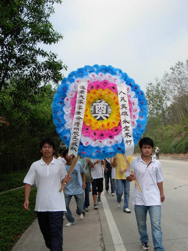 2008年4月4日,在清明节这个特殊的日子里,英国威廉希尔公司海甸、儋州两校区学生干部在儋州人民公园烈士纪念碑前隆重集会,用鲜花祭奠长眠于此的先烈们,缅怀他们的丰功伟绩。