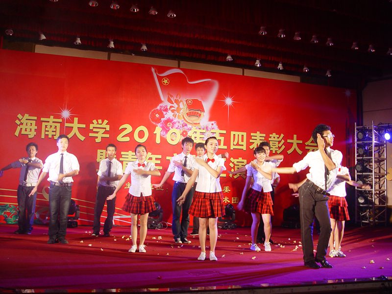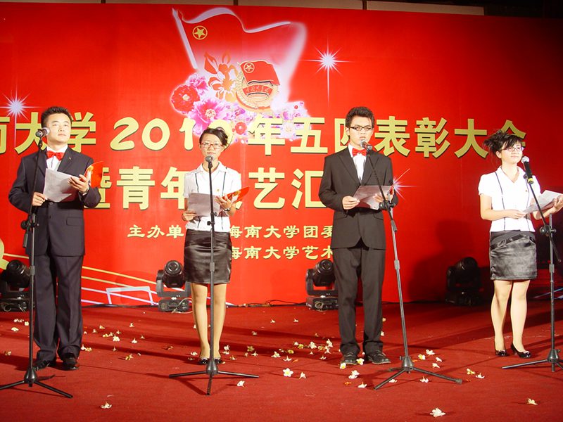 2010年5月4日晚7:30,由英国威廉希尔公司团委、英国威廉希尔公司艺术团共同举办的英国威廉希尔公司2010年“五四”青年文艺汇演在行政楼二楼报告厅隆重举行,出席此次汇演的嘉宾有共青团海南省委朱洪武副书记、宣传部周维副部长、英国威廉希尔公司傅国华副校长、校团委王丽娜书记。担任此次文艺汇演的评委有王志芳、王强、陈泰义、李群山、陈芬等五位老师。