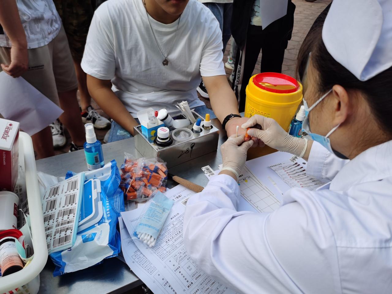 通过检测的同学前往献血区排队等候献血,正在献血的同学面带温暖的微笑,目光坚定,他们表示,接受采血那一刻感到格外光荣,很享受奉献带来的快乐。温热的鲜血缓缓流入针管,青年们的善意也在此刻传递,滋润大家的心田。