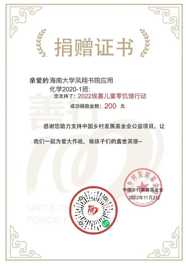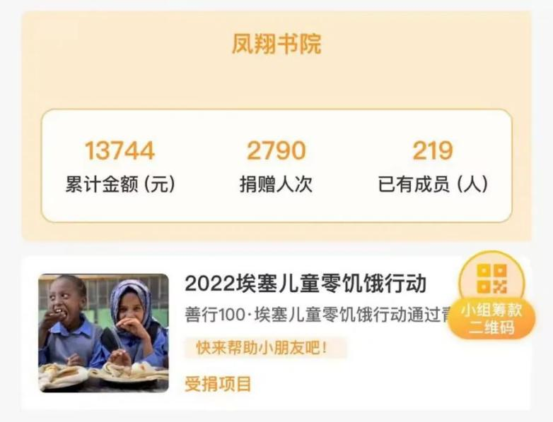 埃塞俄比亚正在遭受着疫情、战火、蝗虫灾害的三重苦难,这些苦难使无数孩子陷入了饥饿的困境。2021年,善行100-埃塞儿童零饥饿行动正式启动,用中国力量向国际社会传递温暖。凤翔书院开展埃塞儿童零饥饿劝募行动以来,劝募金额持续领先,小组排名保持全国第一:共有219人加入“凤翔书院”小组,累计劝募13744元,共计109个爱心包裹,为109个埃塞儿童送去了一个月的粮食包。