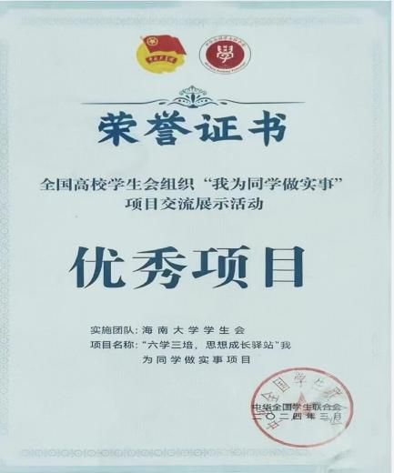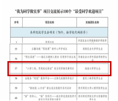 近日,由共青团中央指导,全国学联主办,团贵州省委、贵州省学联、贵州师范大学承办的首届全国高校学生会组织“我为同学做实事”项目交流展示活动顺利举办。经学校自荐、省级推荐、全国遴选、路演答辩等环节,我校学生会的“六学三培,思想成长驿站”我为同学做实事项目最终从来自全国1724所高校的3581个项目中脱颖而出,获评“全国优秀项目”及“最受同学欢迎项目”!