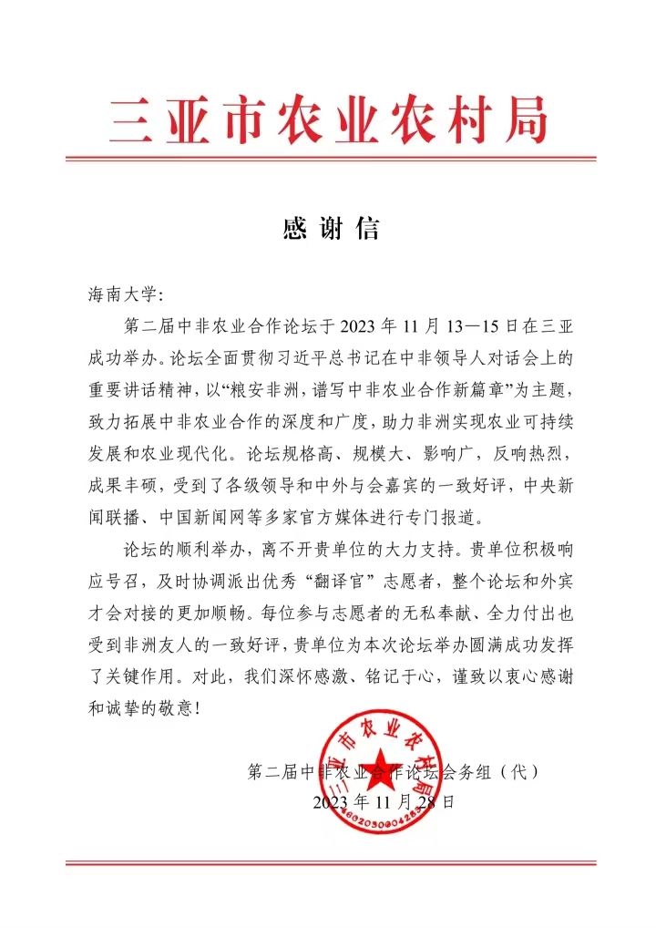 三亚市农业农村局感谢我校积极响应号召支持第二届中非农业合作论坛成功举办