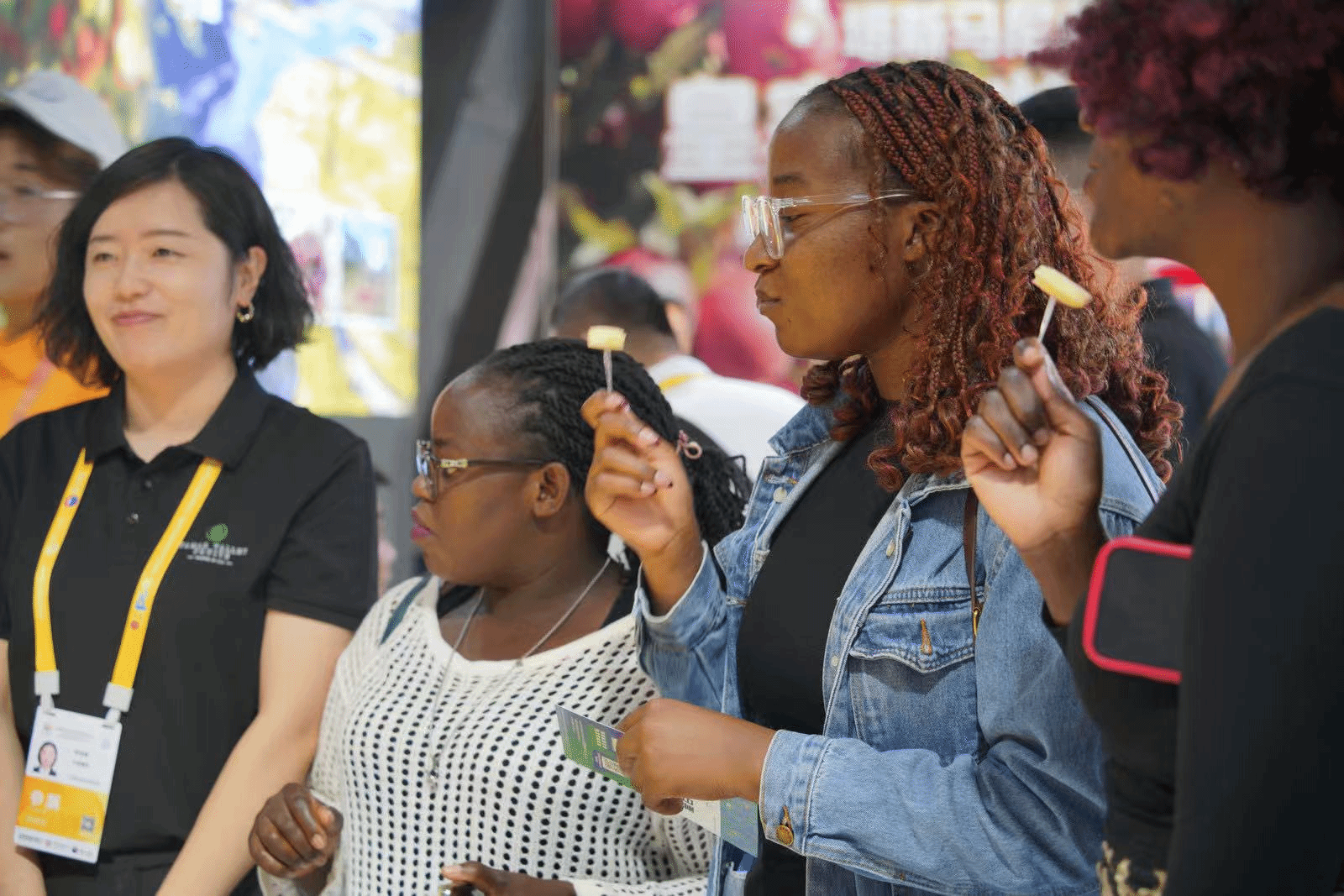 4月15日下午,热区高校青年领袖研学旗舰营成员走进第五届中国国际消费品博览会。这是青年营员们在品尝消博会的优质展品。
