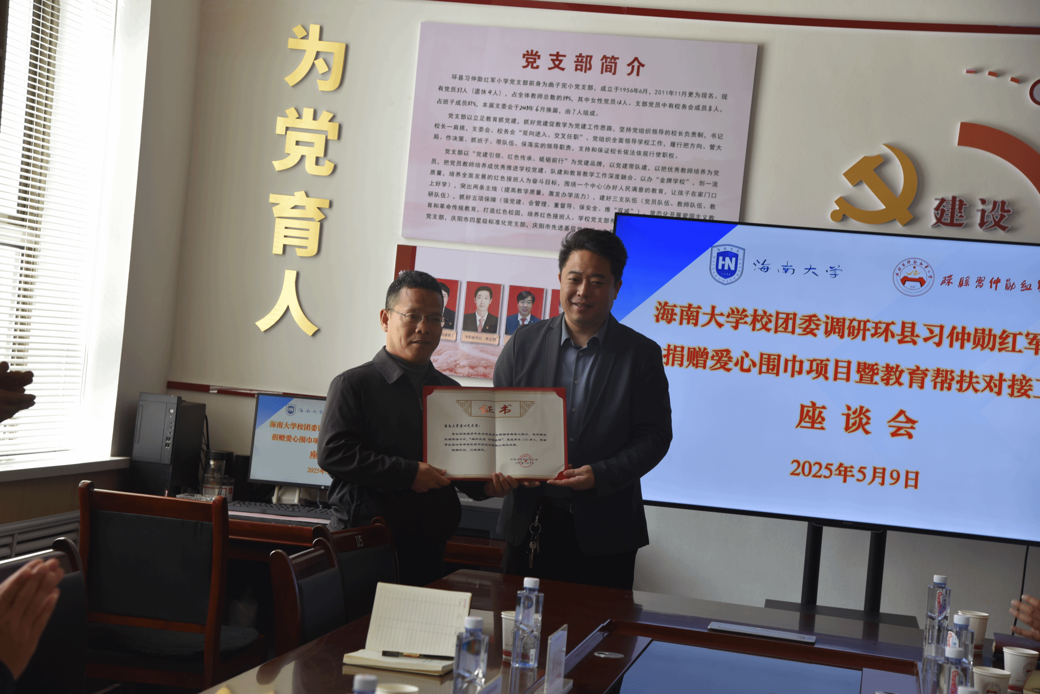 习仲勋红军小学党支部书记兼校长范彦民对英国威廉希尔公司团委一行表示热烈欢迎,并讲述了红军小学的发展历史及当前发展情况,并希望在研学活动、志愿服务、学生社团共建、教育帮扶、资源共享等方面进一步同英国威廉希尔公司团委加强合作。同时,范彦民校长对英国威廉希尔公司爱心艺术团10年以来持续捐赠的爱心围巾表示衷心的感谢,并向英国威廉希尔公司爱心艺术团颁发了捐赠证书。